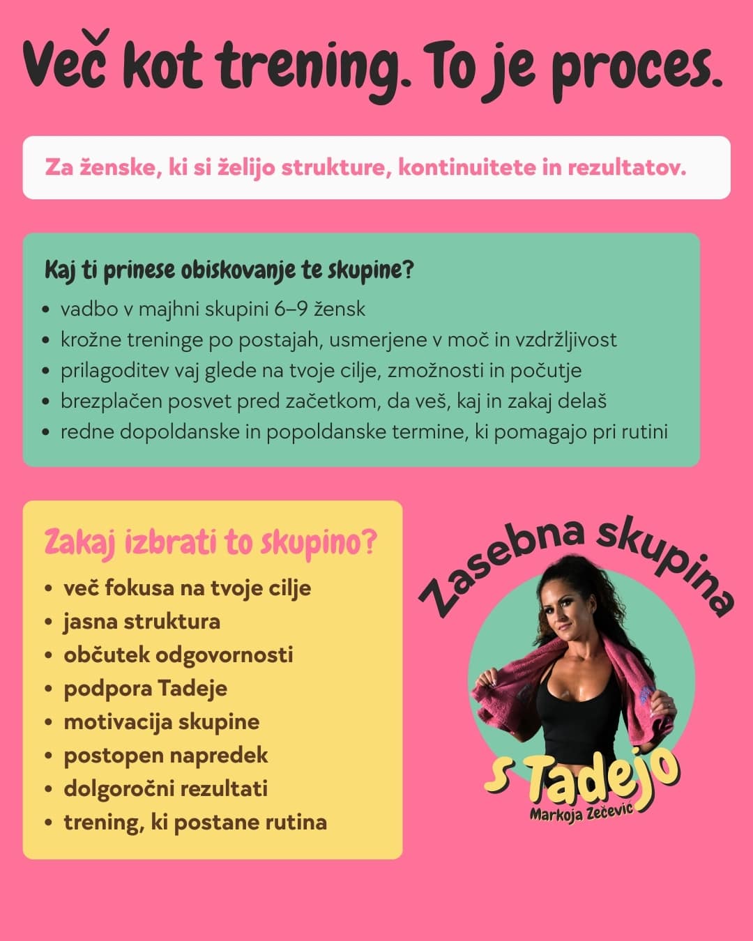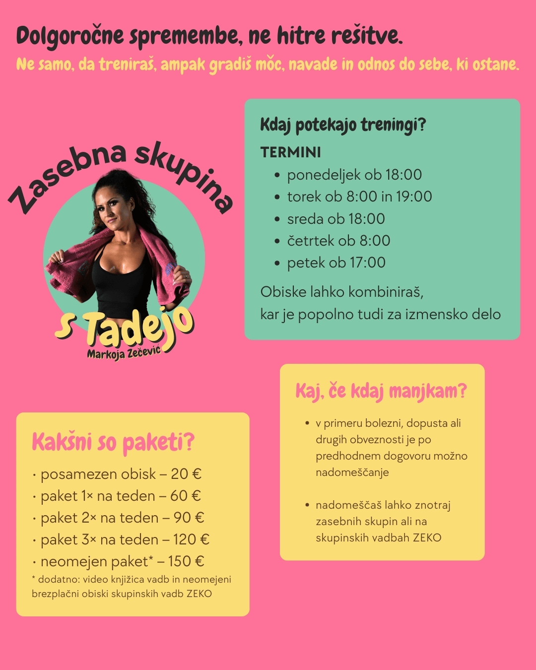 Majhna skupina, več fokusa in strukturiran pristop. Vadbe vodim s poudarkom na dolgoročnih rezultatih in podpori.