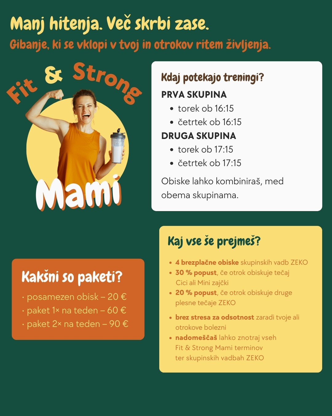 Vadba za mamice, ki se vklopi v družinski ritem. Medtem ko otrok pleše, ti treniraš – brez dodatnega usklajevanja in stresa.